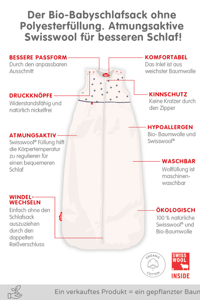 + Schlaf ohne Chemikalien: Neben der Swisswool-Wolle werden unsere Baby-Schlafsäcke aus Bio-Baumwolle hergestellt und enthalten daher keine schädlichen Chemikalien wie Pestizide.