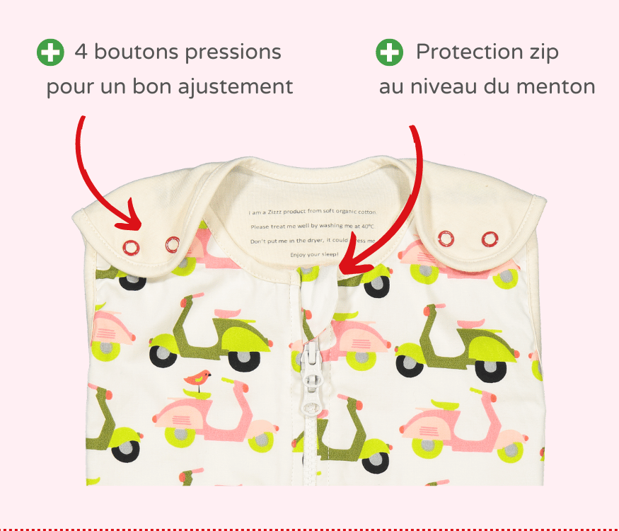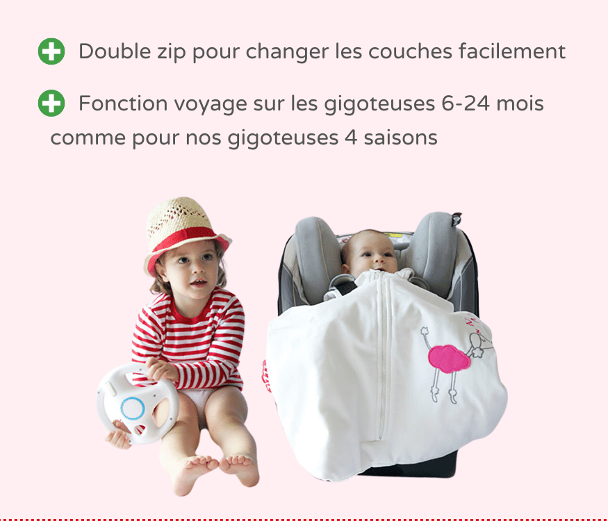 Les gigoteuses taille 6-24 mois ont une ouverture à l’arrière pour laisser passer la ceinture de sécurité.Pratique pour les parents.