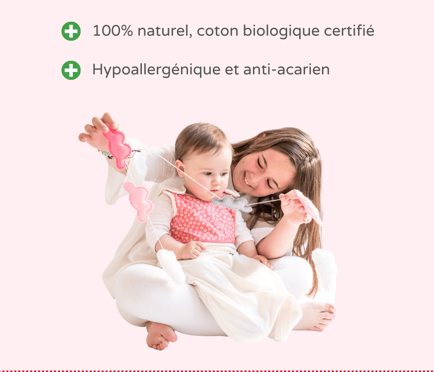 Les fibres de coton bio de par leur structure et leur bonne circulation d'air réduisent l'humidité et créent un climat qui n'est pas favorable à la prolifération des acariens.