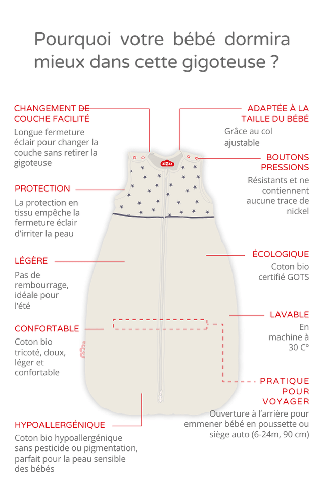 Le confort et la sécurité du bébé sont au coeur de nos préoccupations. Nous avons pour cela opté pour des gigoteuses sans manches qui offrent une liberté de mouvement mieux adaptée aux bébés.